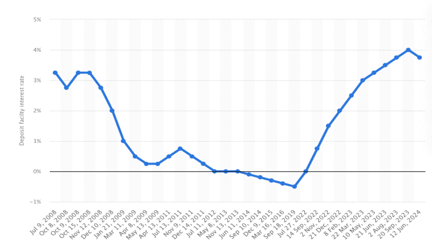 Die EZB hatte in den letzten Jahren die Zinsen erhöht, um die steigende Inflation zu bekämpfen. Im Laufe des Jahres 2024 hat die Inflation begonnen, sich zu normalisieren und liegt derzeit nahe der Zielinflationsrate der EZB von 2 %. Im September 2023 hob die EZB den Einlagensatz auf ein Jahrzehnthoch von 4 % an, um der Inflation entgegenzuwirken, die sich Ende 2022 zwischen 6 % und 10 % bewegte und im Oktober 2022 mit 10,6 % ihren Höhepunkt erreichte.