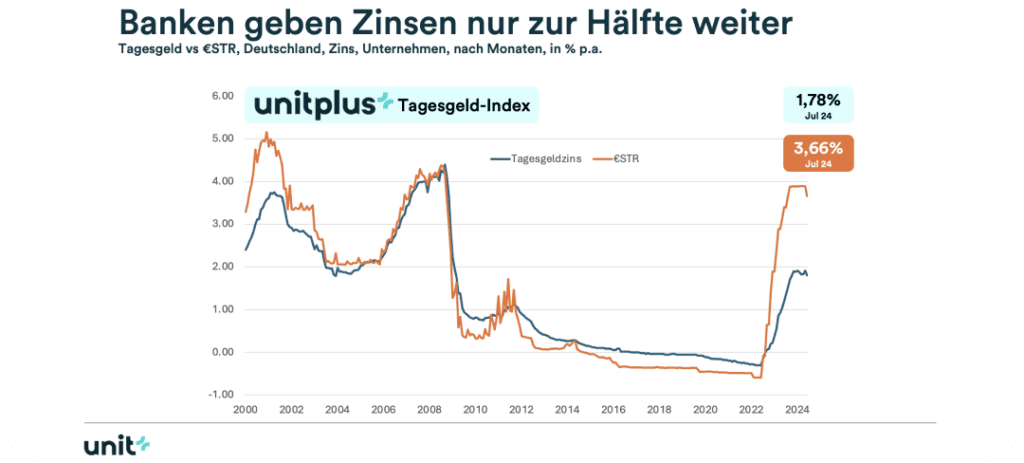 UnitPlus Business konzentriert sich auf die Herausforderungen, die sich aus der schleppenden Weitergabe von Zinserhöhungen durch Banken an ihre Einleger:innen in Deutschland ergeben. Obwohl die Europäische Zentralbank (EZB) die Zinssätze in den vergangenen Jahren erhöht hat, geben die Banken oft nur einen Bruchteil dieser Erhöhungen weiter, so dass die Einlagenzinsen niedrig bleiben (1,78 % ab Juli 2024). Dies steht in starkem Gegensatz zu Geldmarktfonds, deren Renditen sich stärker an den EZB-Zinsen orientieren (UnitPlus Business erzielte im Juli 24 eine annualisierte Rendite von 3,67 %).