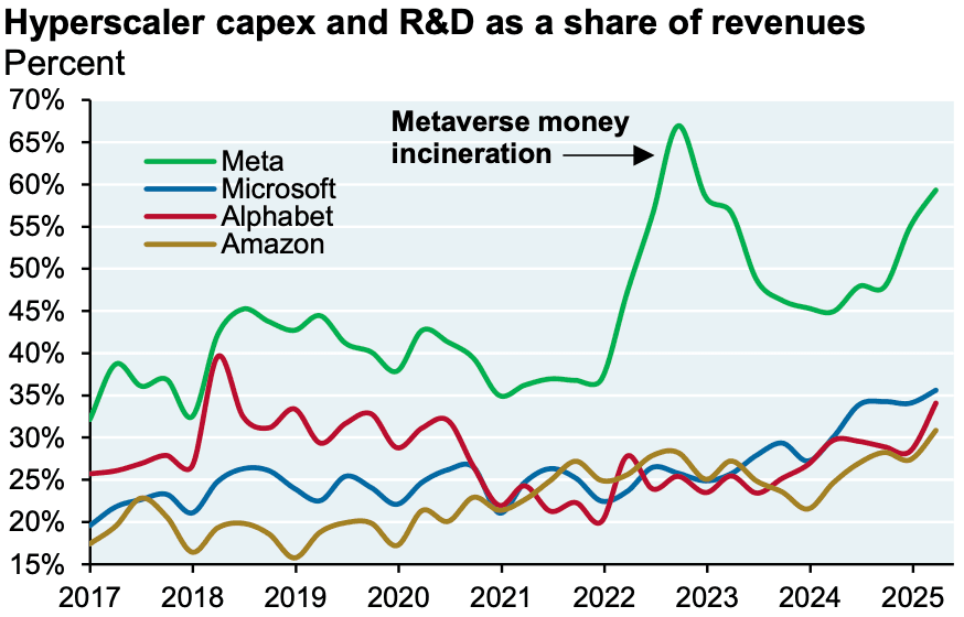 Während KMUs versuchen, mitzuhalten, investieren die großen Tech-Konzerne massiv in ihre Infrastruktur. Die folgende Grafik zeigt, wie rasant die CapEx- und R&D-Ausgaben führender Hyperscaler (Amazon, Microsoft, Alphabet, Meta) steigen – insbesondere im Bereich Cloud & KI.