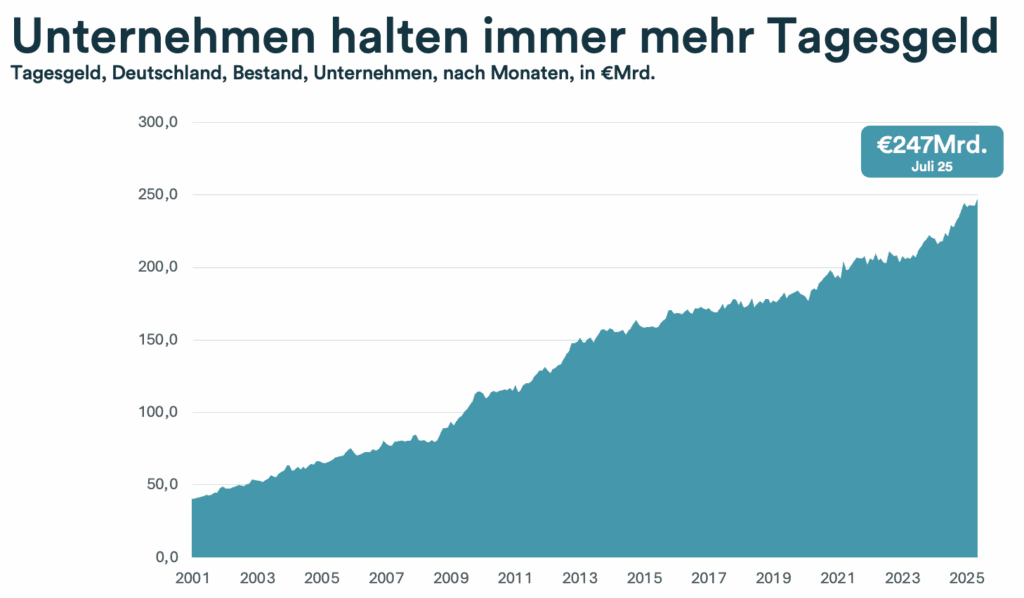Besonders alarmierend: 247 Milliarden Euro an Unternehmensliquidität liegen derzeit auf Tagesgeldkonten – ein historischer Höchststand. Damit wächst die Summe ungenutzter Potenziale. Während Unternehmen versuchen, in einem wettbewerbsintensiven Umfeld ihre Effizienz zu steigern, verlieren sie jährlich Milliarden – schlicht durch schlechte Weitergabe von Zinsen.