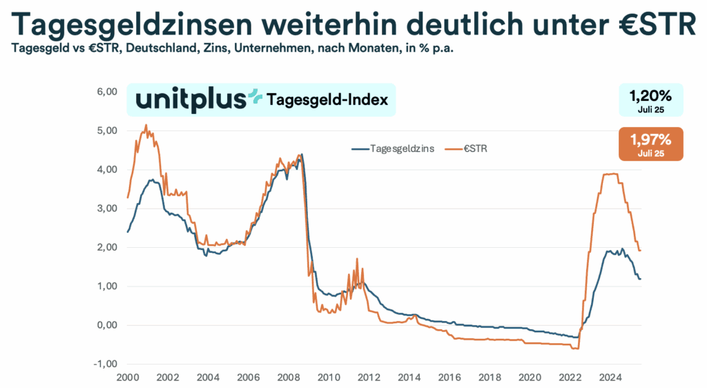 Während die Europäische Zentralbank (EZB) den Leitzins zuletzt mehrfach gesenkt hat – auf nun 2,00% – hat sich auch die Weitergabe der Zinsen durch Banken weiter verschlechtert. Laut dem UnitPlus Tagesgeld-Index für Unternehmen reichen deutsche Banken aktuell nur knapp über 50 % der möglichen Zinsen an ihre Geschäftskunden weiter. Der Rest bleibt in den Margen der Banken hängen.