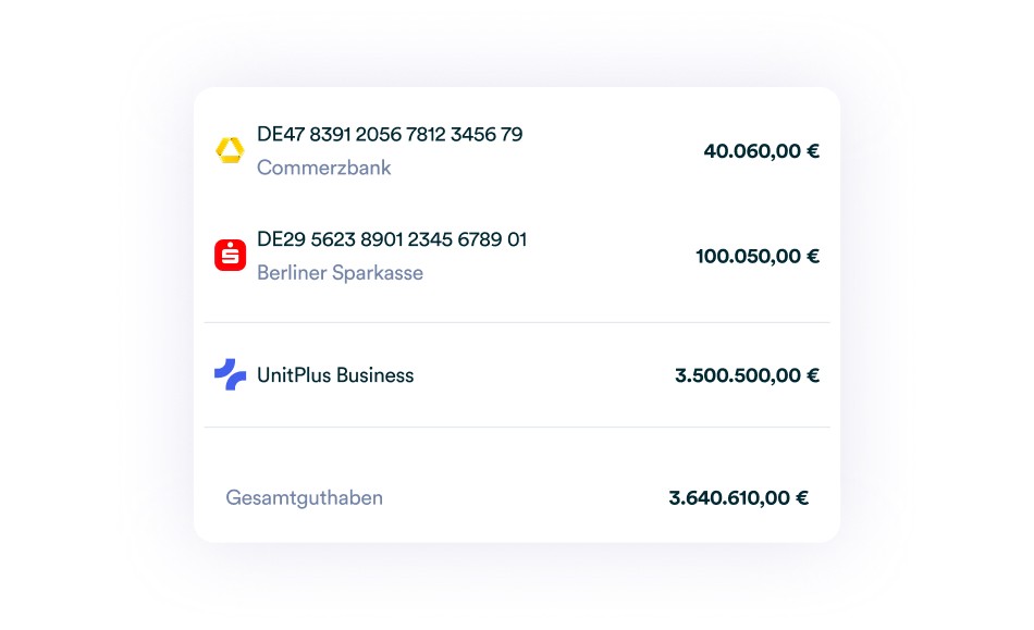 Verbinden Sie Ihre Geschäftskonten und behalten Sie Ihre Liquidität in Echtzeit im Blick. Überweisen Sie Ihr Geld jederzeit zurück auf Ihre Bankkonten.