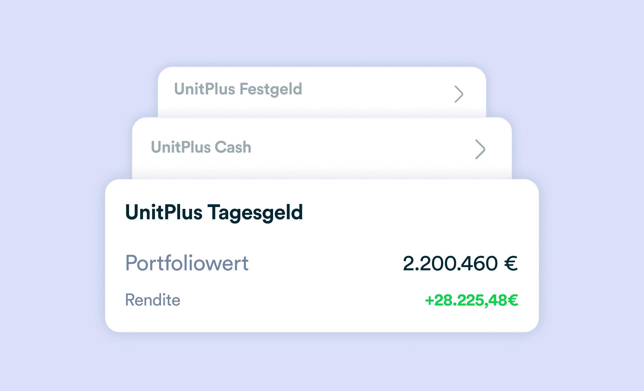 Für Unternehmen, die kurzfristige Liquidität wie Tagesgeld anlegen möchten, bietet UnitPlus Tagesgeld die optimale Alternative. Die Verzinsung liegt dauerhaft über dem EZB-Einlagenzinssatz. Ohne Mindestlaufzeit und ohne begrenzten Aktionszeitraum.