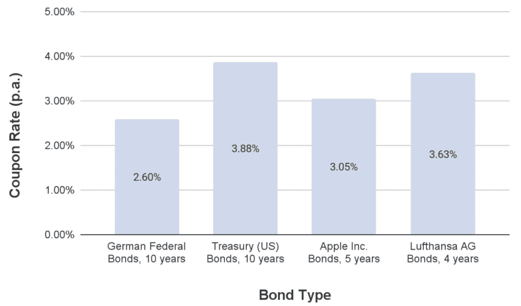 Below are some examples of bonds issued by governments and companies and their respective coupon rates.
