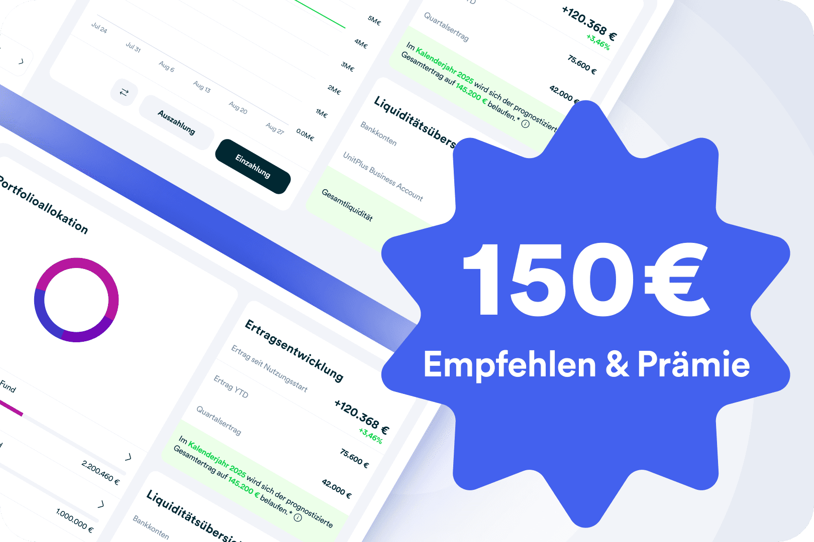 You’re already using UnitPlus privately to invest your money smartly. Now you can share the same benefits with fellow entrepreneurs – and profit yourself: Recommend UnitPlus Business with our new capital market CFO for companies and secure a €150 UnitPlus bonus in your account.