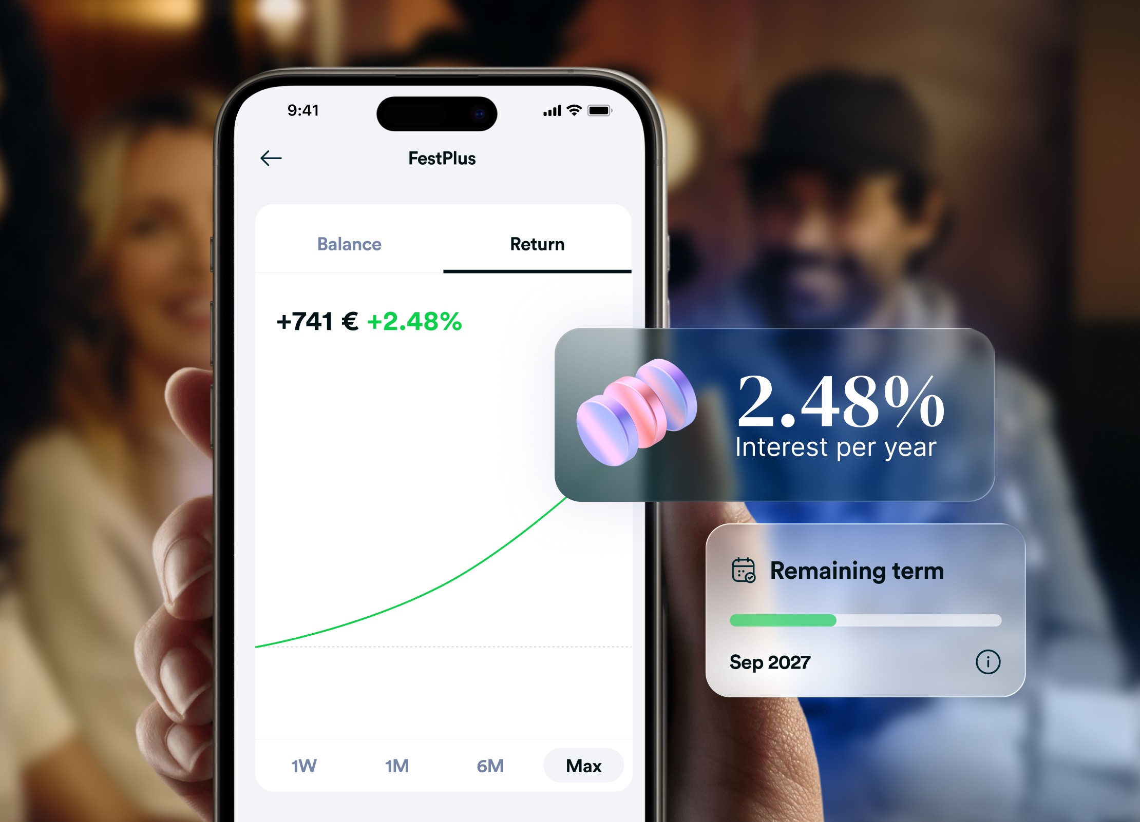 Achieve up to 2.48% annual return* – with a fixed term until September 2027 while maintaining full flexibility: You can have your money repaid at any time during the term. Ideally combinable with ZinsPlus as an attractive alternative to a savings account.